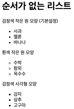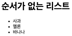 - 순서가 없는 리스트는 <ul>태그로 시작하며, 여기에 포함되는 각각의 리스트 요소는 <li>태그로 시작합니다.