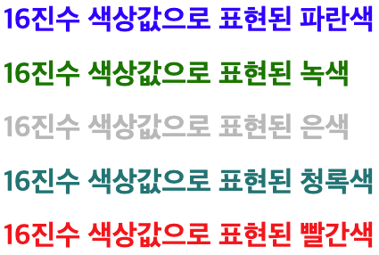 - 16진수 색상값은 RGB 색상값을 각각 16진수로 변환한 것입니다.