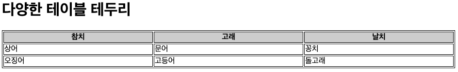 위의 예제에서 테이블의 테두리(border)가 두 줄씩 나타나는 이유는 <table>태그와 <th>태그, <td>태그가