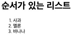 - 순서가 있는 리스트는 <ol>태그로 시작하며, 여기에 포함되는 각각의 리스트 요소는 <li>태그로 시작합니다.