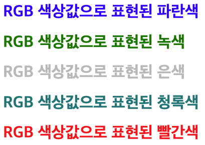 <h1 style="color:rgb(0,128,128)">RGB 색상값으로 표현된 청록색</h1>