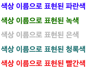 <h1 style="color:teal">색상 이름으로 표현된 청록색</h1>
