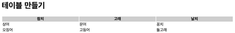 - <th>태그는각 열의 제목을 나타내며, 모든 내용은 자동으로 굵은 글씨에 가운데 정렬이 됩니다.