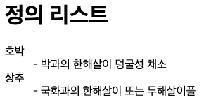 - 정의 리스트(description list)는 용어와 그에 대한 정의를 모아놓은 리스트로 <dl>태그로 시작합니다.