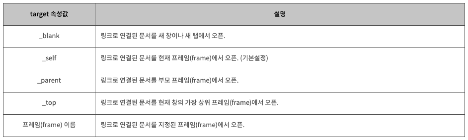 - <a>태그의 target 속성은 링크로 연결된 문서를 어디에서 열지를 명시합니다.