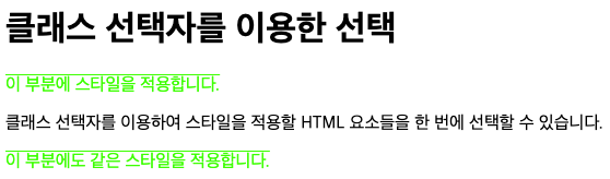 <p>클래스 선택자를 이용하여 스타일을 적용할 HTML 요소들을 한 번에 선택할 수 있습니다.</p>