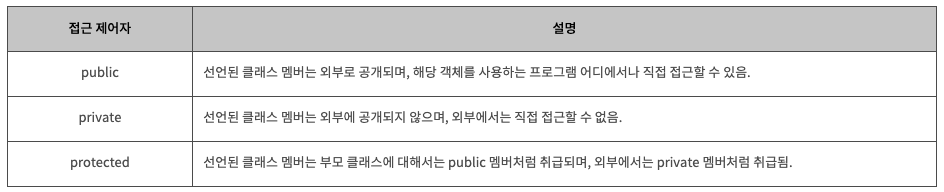 - 접근 제어자를 사용하면 클래스 외부에서의 직접적인 접근을 허용하지 않는 속성이나 메소드를 선언할 수 있기 때문에 정보 은닉(data hiding)과 캡슐화(encapsulation)를 구체화할 수 있습니다.