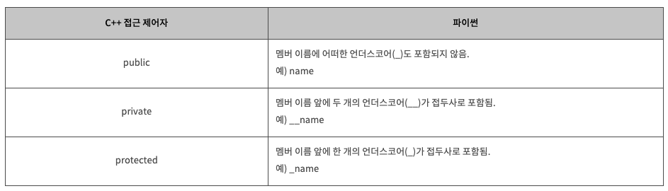 - 하지만 파이썬에서는 이러한 접근 제어자를 사용하지 않고도, 변수나 메소드의 이름을 작성할 때 그 작명법(naming)에 따라 접근 제어를 구현하고 있습니다.